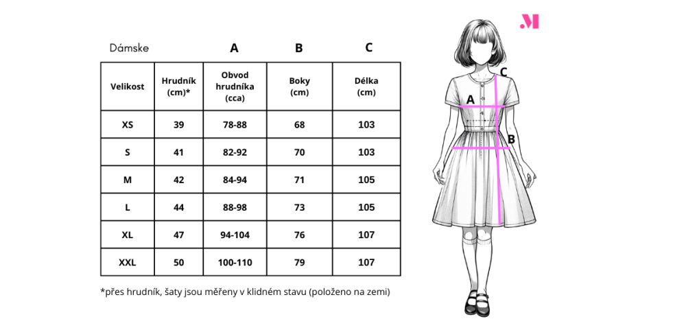 Střih šatů je pod prsy, díky čemuž se skvěle přizpůsobí i během těhotenství. Kojení je řešeno překládaným výstřihem, který je ukrytý pod horním předělem s jemným obloučkovým výstřihem – pohodlné, rychlé a diskrétní kojení kdekoliv.